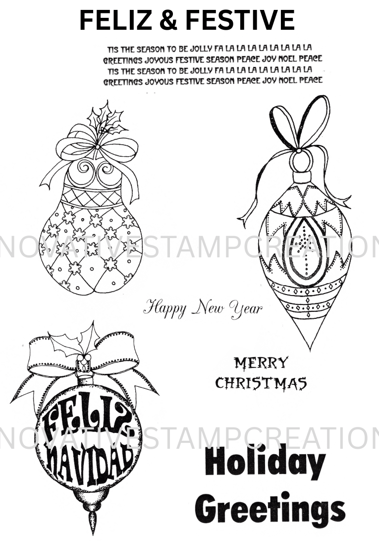 Celebrate the season in two languages with FELIZ & FESTIVE, a cheerful red rubber stamp sheet that blends traditional holiday charm with Latin flair. Featuring vintage ornaments, joyful phrases, and timeless holiday greetings, the sizes of each are LARGE 3x 4 approx) unmounted stamp sheet is perfect for journals, handmade cards, gift tags, and December dailies.
